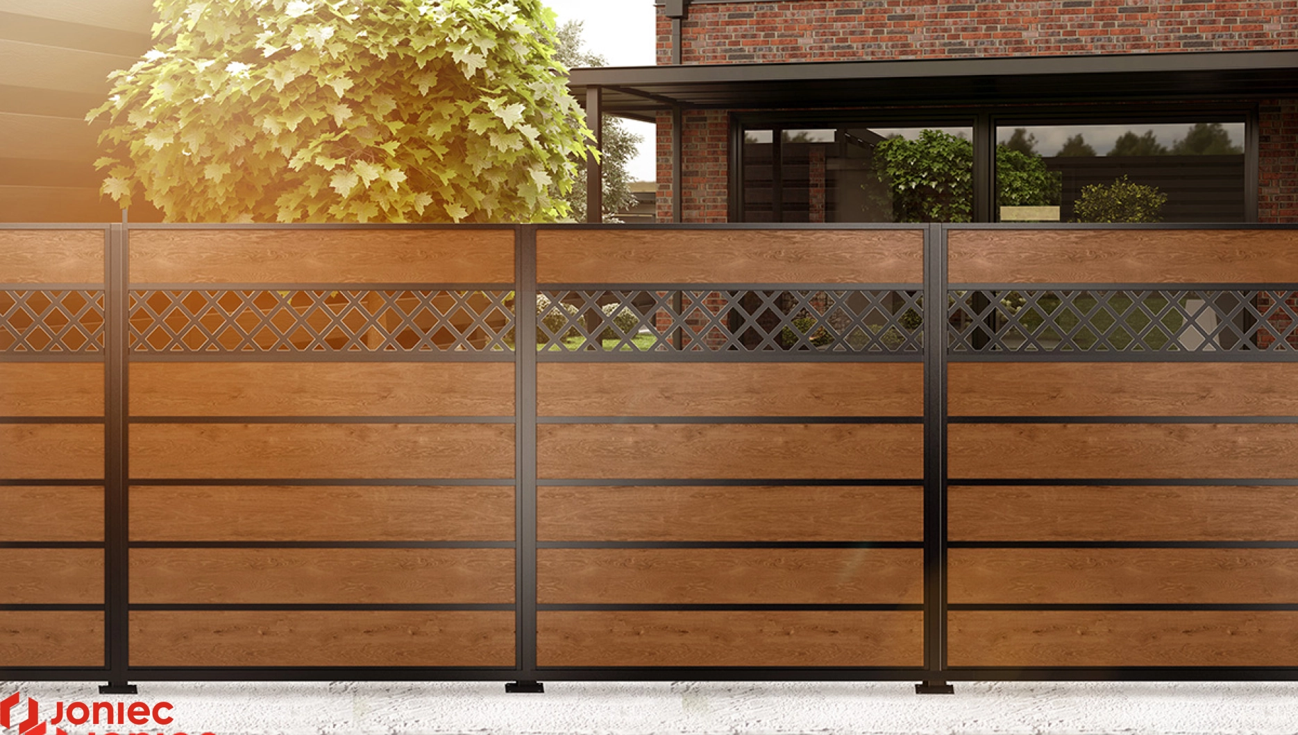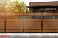 La serie de vallas de paneles de aluminio se caracteriza por una elegancia excepcional . Está fabricada en aluminio de color bronce con un revestimiento muy resistente similar a la madera con una estructura claramente visible y táctil.